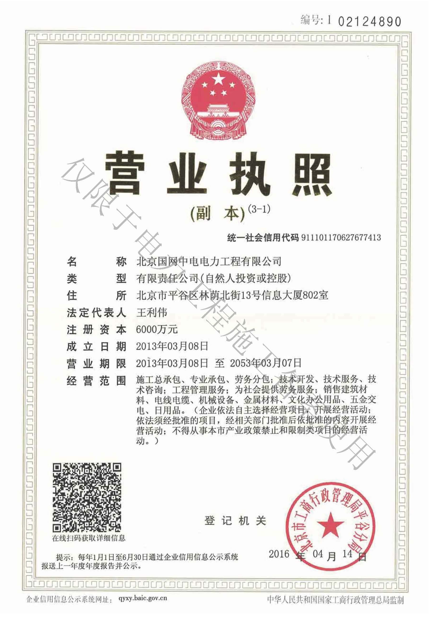 北京國網中電電力工程有限公司,已取得國家電監會頒發的《承裝(修、試)電力設施許可證》、為電力施工承裝四級、承修四級、承試四級企業。北京市住房和城鄉建設委員會頒發的房屋建筑施工總承包二級、機電設備安裝工程專業承包二級、輸變電專業承包二級、城市及道路照明工程專業承包二級、市政公用工程總承包二級資質、勞務不分等級,已通過ISO9001:2015 GB/T50430-2017質量管理體系、GB/T24001-2016/ISO 14001:2015環境管理體系、